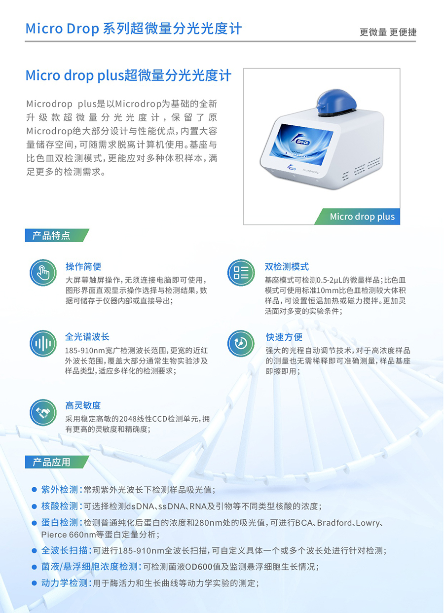 Microdrop plus超微量分光光度計是寶予德Microdrop的升級款,體積小巧,方便放置于各種空間能快速準確地檢測微量(0.5-2uL)樣品中目標物質(zhì)的吸光值,波長(cháng)掃描范圍廣,通過(guò)其寬闊的觸摸屏可以輕松簡(jiǎn)單地進(jìn)行操作。它具有多種檢測模式,能夠輕松應對不同檢測實(shí)驗室中對樣本中DNA/RNA/蛋白質(zhì)等生物分子物質(zhì)的吸光度檢測。